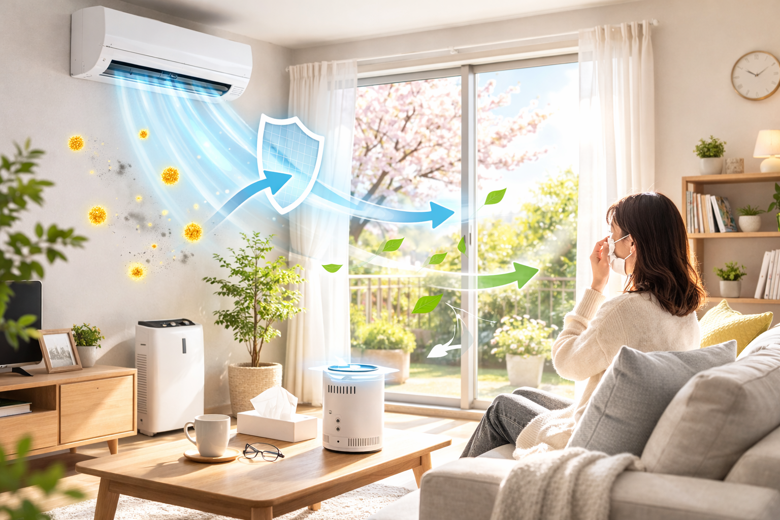 春先になると、「エアコンをつけると花粉は部屋に入ってくるの?」「換気しなければ大丈夫?」といった疑問を持つ方が増えます。花粉症の方にとって、室内の空気環境はとても重要です。