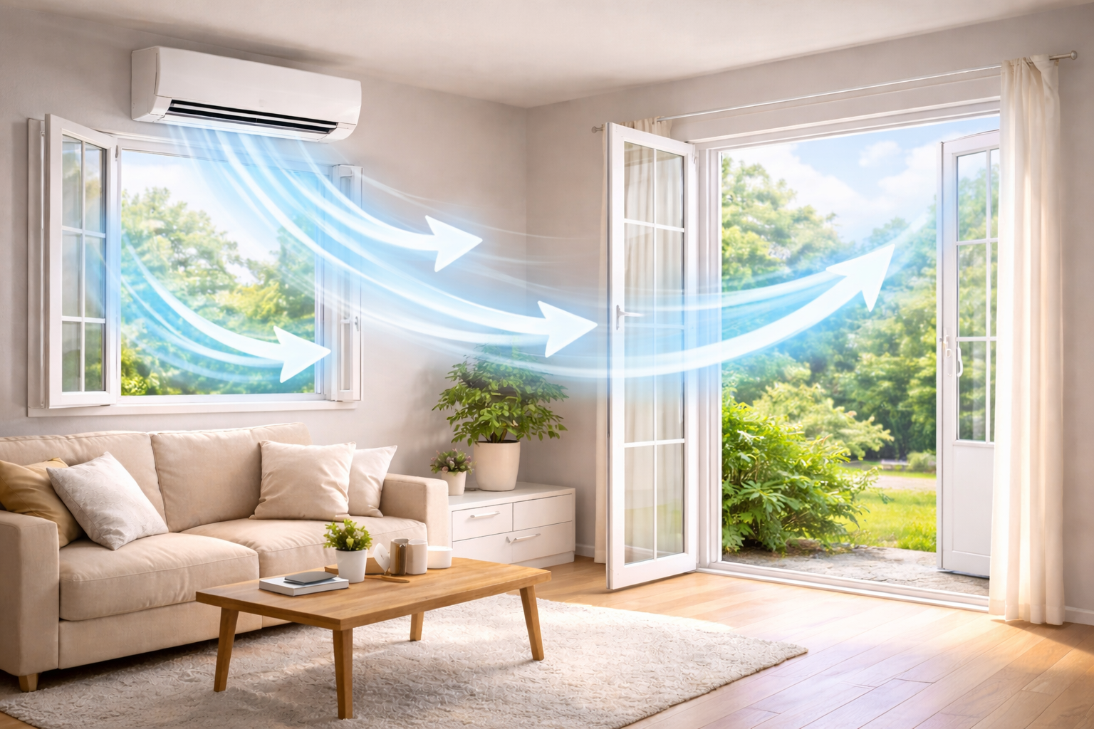 エアコンを使用しているとき、「窓を開けて換気しても大丈夫なの?」「冷暖房の効率が下がるのでは?」と疑問に思う方も多いのではないでしょうか。