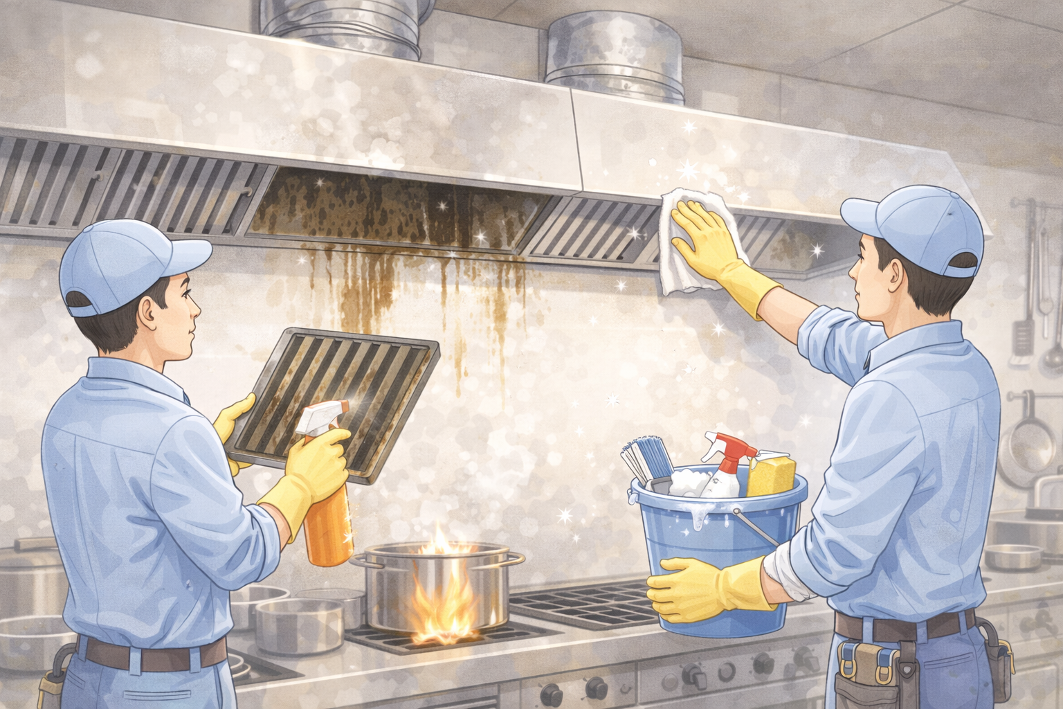プロ業者は高圧洗浄機や専用薬剤を使用し、頑固な油脂を除去します。