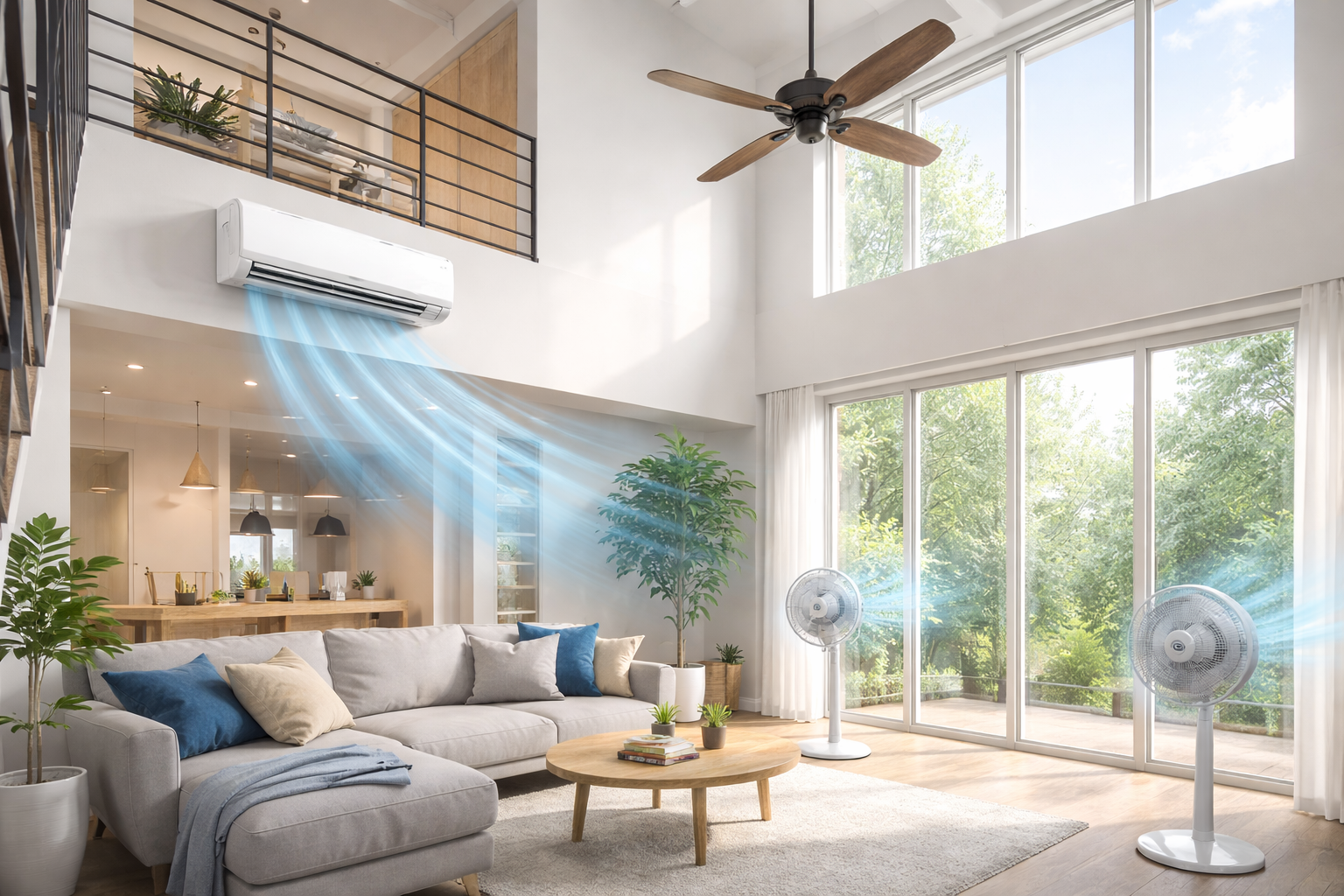 近年のZEH住宅や高性能住宅では、「吹き抜け+エアコン1台全館空調」に近い使い方も増えています。