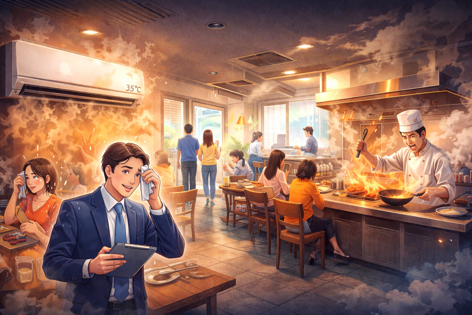 最初は一時的な停止かと思われましたが、数分経っても復旧しません。室内の温度は徐々に上昇し、厨房の熱も加わり、店内はすぐに蒸し暑い状態になりました。