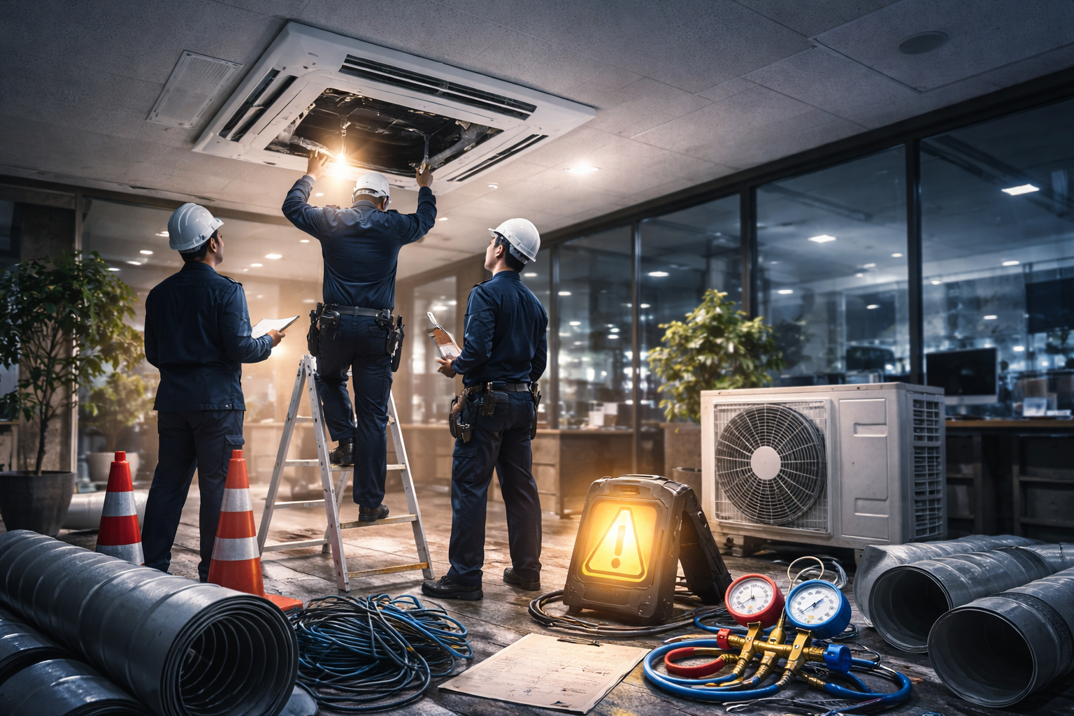 本記事では、「夜間工事が必要になるケース」をテーマに、なぜ夜間に空調工事を行うのか、具体的な現場事例、メリット・デメリット、注意点まで詳しく解説します。店舗・オフィス・工場・医療施設などの設備更新を検討している方は、ぜひ参考にしてください。
