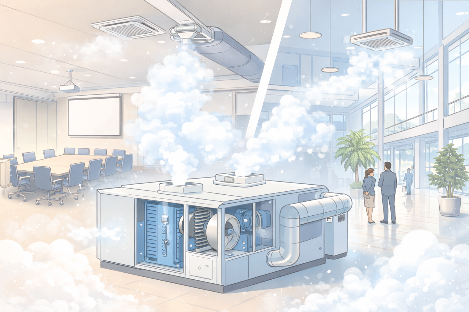 オフィスビル、商業施設、病院、工場、学校などの大型施設では、冬場の乾燥対策が重要なテーマです。家庭用加湿器とは異なり、広い空間を均一に加湿するには空調設備側での加湿制御が欠かせません。その中心となるのがエアハンドリングユニット(エアハン)による加湿方式です。