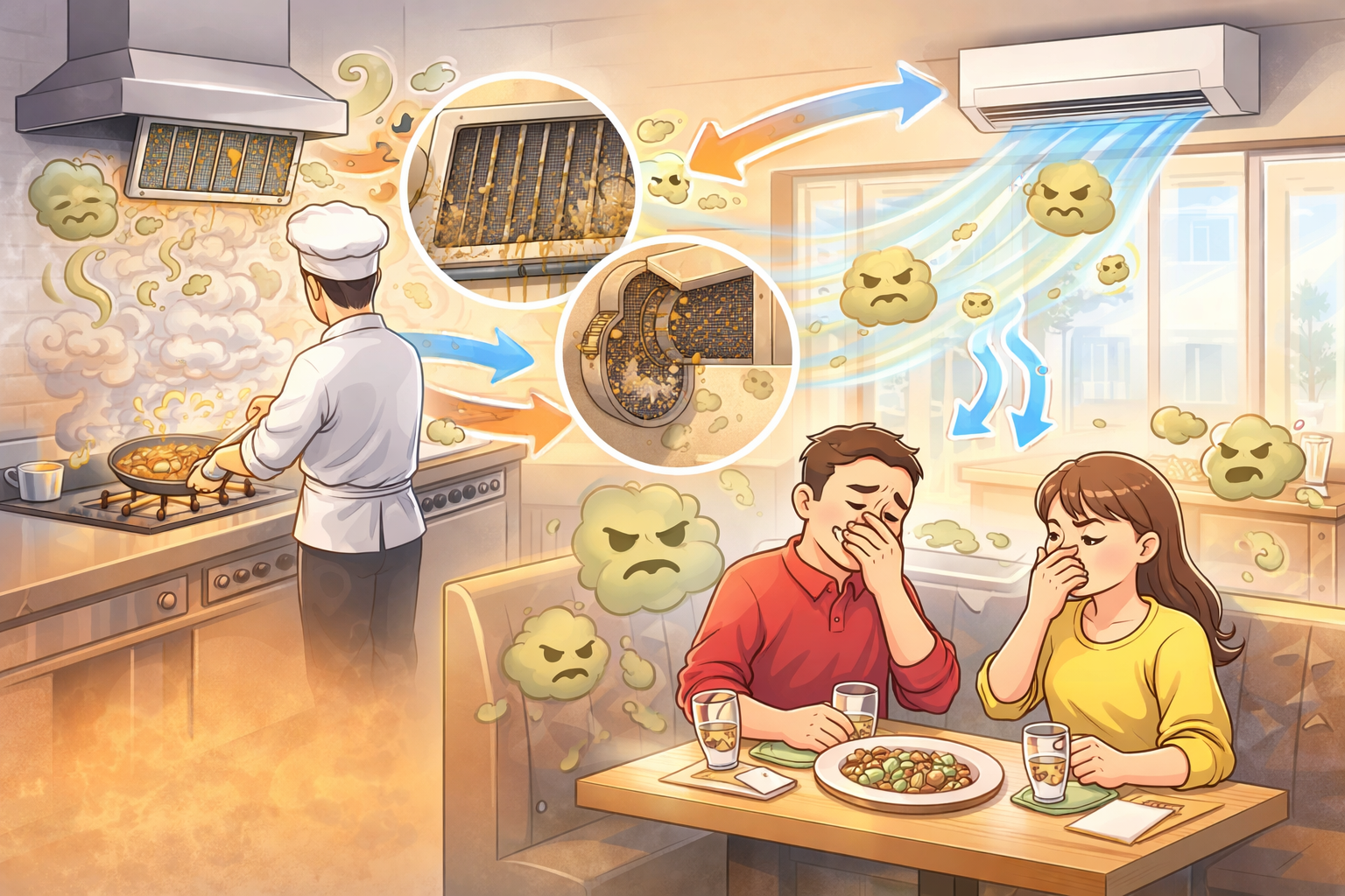 料理の良い香りであれば問題ありませんが、油のニオイや煙、こもった空気の臭いが広がると、お客様の満足度低下やクレームの原因になることもあります。