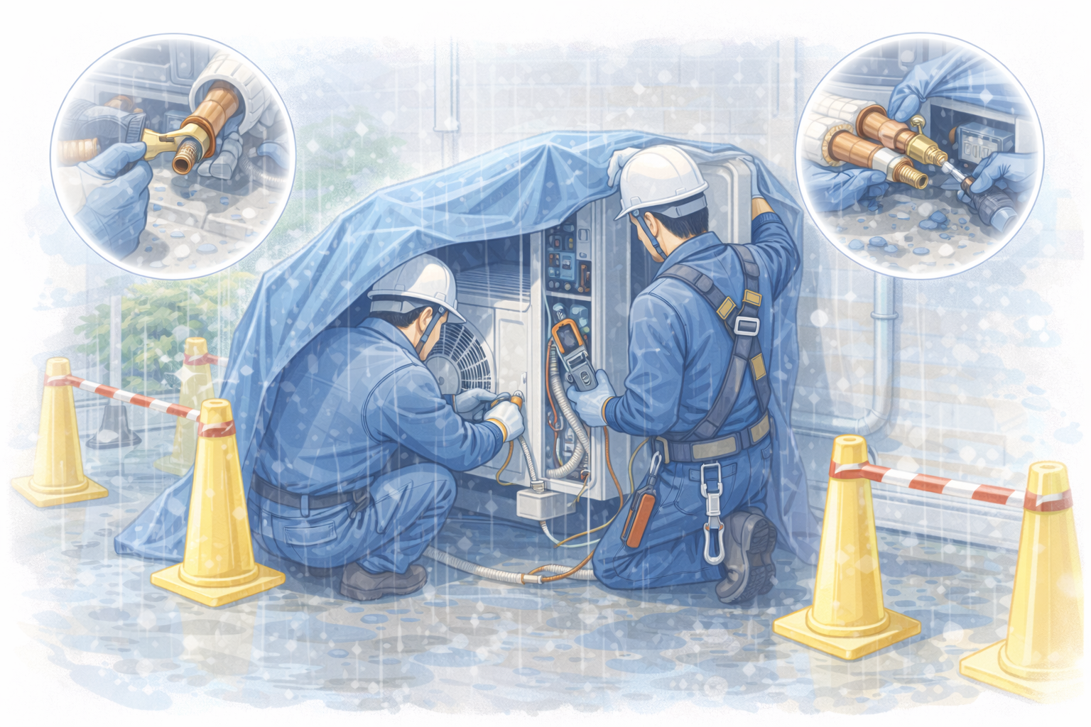 本記事では、エアコン工事における雨天時施工の対策・注意点・延期判断の基準・安全管理体制について詳しく解説します。施工業者様・法人担当者様・一般のお客様の双方に役立つ内容です。