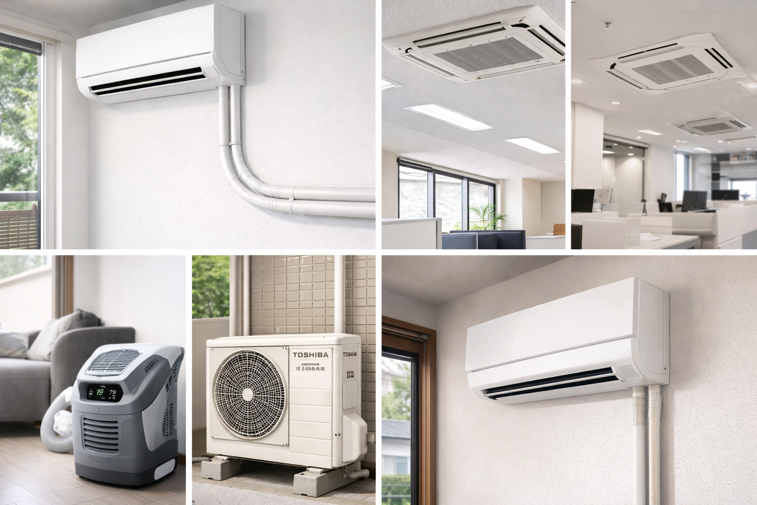 国内主要エアコンメーカーすべてに対応し、住宅用から業務用まで幅広い空調設備を取り扱っています。